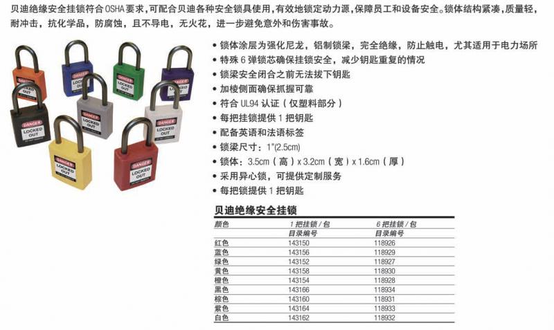 特性和優(yōu)點:1• 外形緊湊,質(zhì)量輕      2  • 一體式“無縫”鎖體結(jié)構(gòu)經(jīng)久耐用• 玻璃纖維強化尼龍鎖體,防撞性能更佳  3• 三重涂層硬質(zhì)鋼鎖梁具有出色的防腐蝕性能   4• 特殊6彈鎖心確保掛鎖安全,進一步減少鑰匙重復(fù)的情況   5• 安全功能可避免在鎖梁安全閉合之前拔下鑰匙。  6• 即使佩戴手套,加棱側(cè)面仍可確保抓握可靠   7• 可提供8種醒目顏色    8• 單獨出                                 售,提供6個裝套裝     9• 每把掛鎖提供1把鑰匙